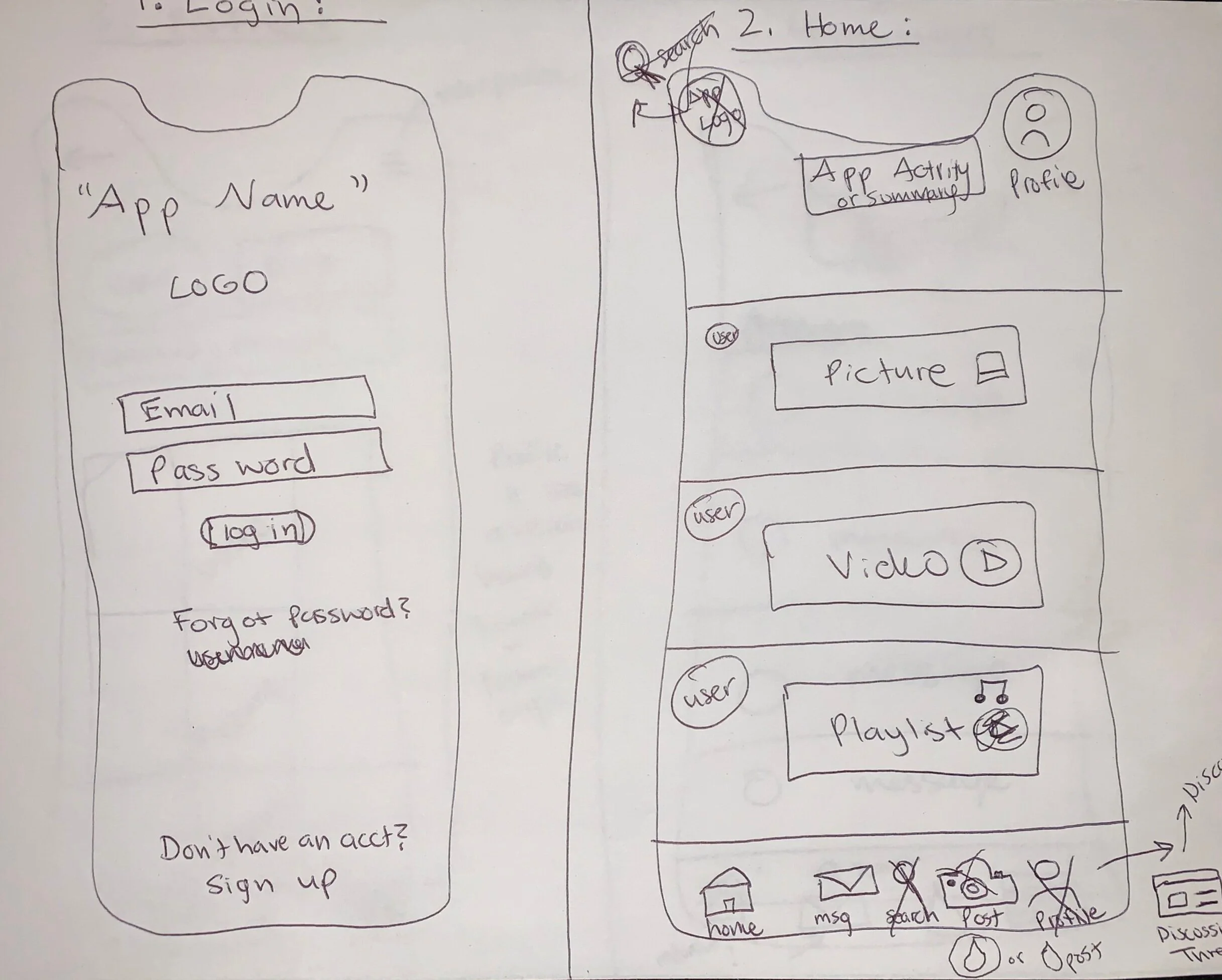 2 - Home: Instagram inspired feed. Lots of changes to bottom icons. Search and profile icons were deemed unnecessary, post icon switched from camera to to drip icon, and discussion thread icon added.