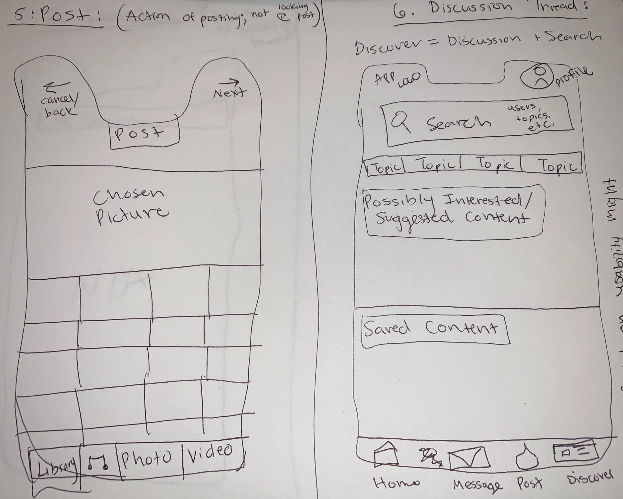 3 - Profile: Profile is similar to a vision board. Inspiration from Tumblr and Pinterest. Main icons were selected for navigation pane (home, message, post, and discussion thread).